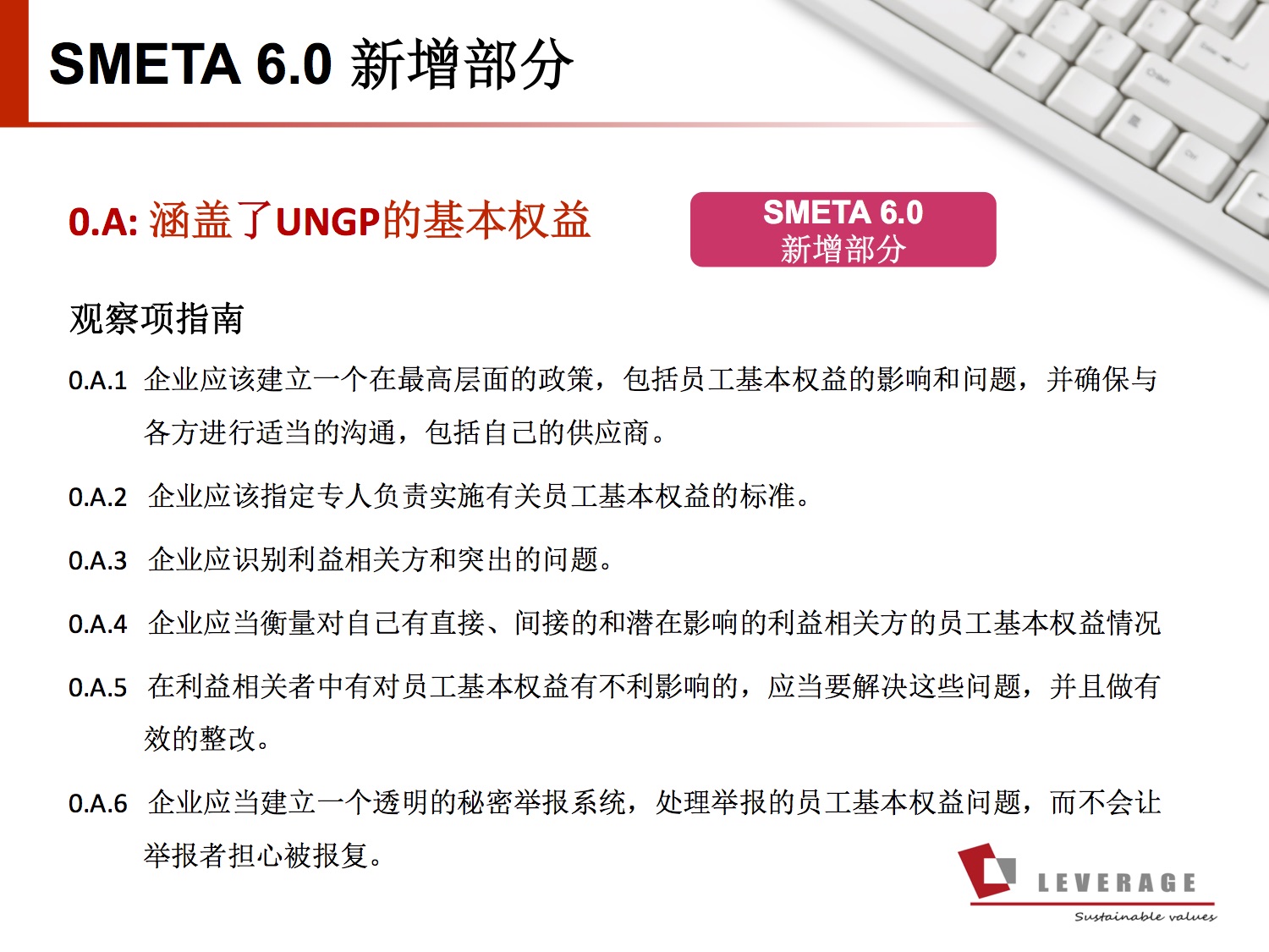 Leverage 作为SMETA 6.0中文版核心内容的指定翻译机构,对 SMETA 6.0 有着更充分的了解,为学员更到位地总结与解析新的和更改的内容: