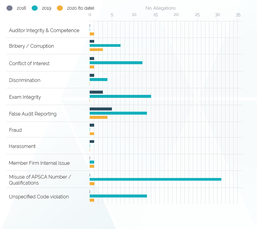 自2017年以来,APSCA的道德与诚信团队已处理120多项违规行为。随着审核员注册人数的持续增长,违规数量也同步增加。在2019年的报告中,平均每43位注册审核员会涉及1项违规。APSCA认为,这反映出APSCA《专业行为准则与标准》得到了更好的理解和应用,同时也体现出管理与投诉程序评估体系的完善。