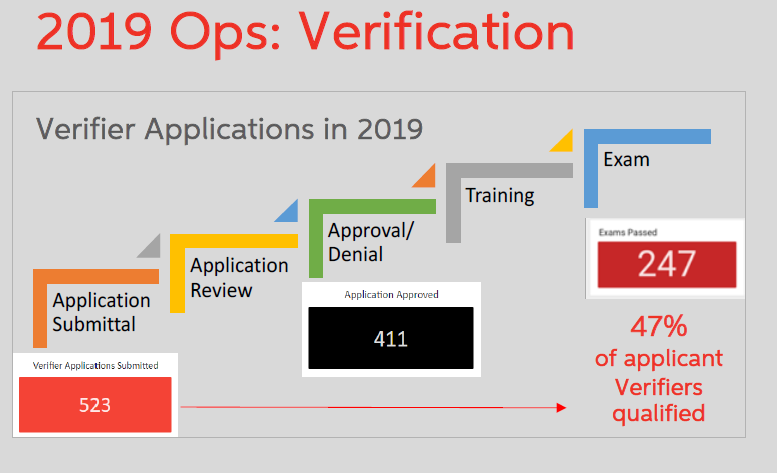 - 有247名验证员被核准(验证员申请523人次,文审通过411人次, 最终通过考试的247人。总体通过率47%)