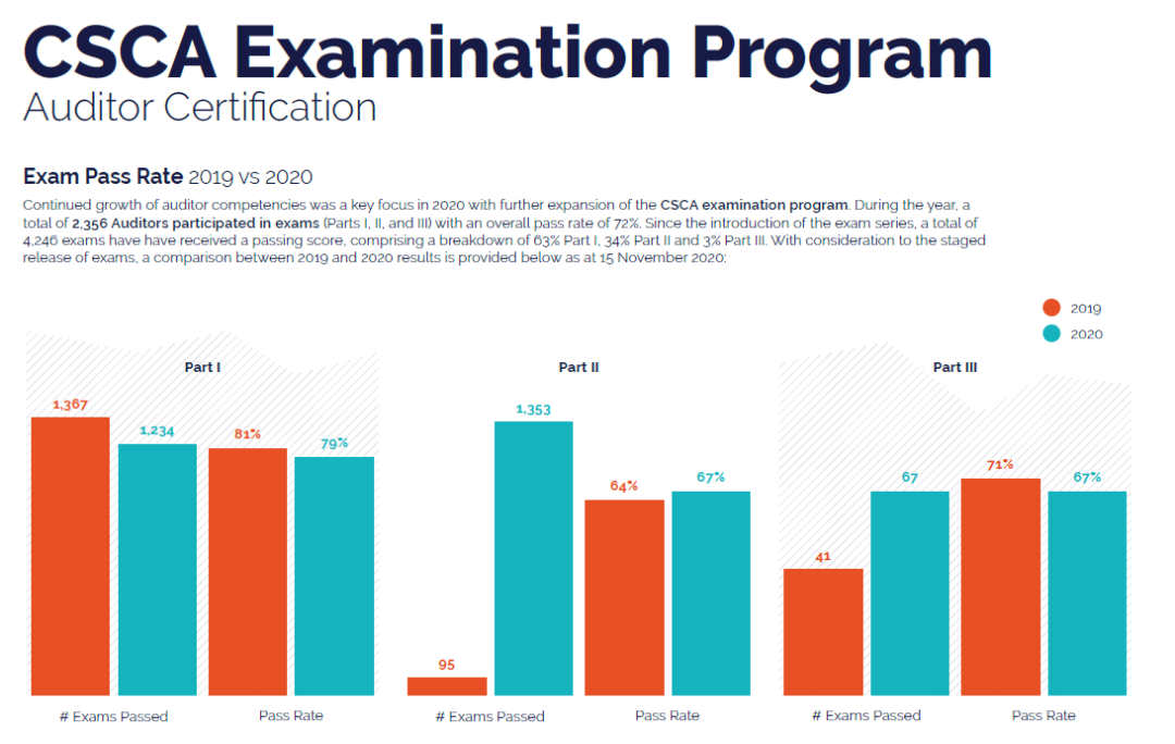 1.随着CSCA考试的进一步扩大,审核员能力的持续增长是2020年的重点。在这一年中,共有2356名审核员参加考试(PartⅠ & Ⅱ & Ⅲ),总通过率为72%。自CSCA考试推行以来,共计4,246次考试获得及格分数,其中63%为PartⅠ,34%为PartⅡ,3%为PartⅢ。2019年和2020年成绩对比可参考下图(截至2020年11月15日):