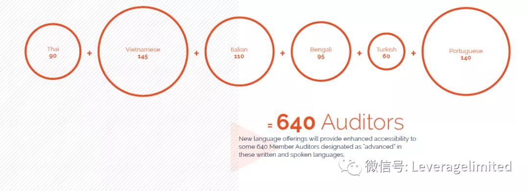 3.目前提供英语、简体中文、繁体中文、西班牙语四种语言的考试。2021年,将新增以下6种语言的考试:孟加拉语,意大利语,土耳其语,泰语,越南语和葡萄牙语,这意味着大约新增640名审核员可用自己熟练掌握的语言·参加考试,考试适用性将提升26%。