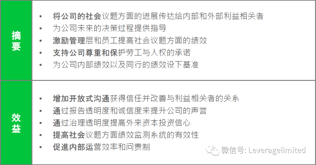 重要性:作为可持续发展的核心组成部分,劳工与人权是公司可持续发展报告中重要的社会议题。报告是指传达和呈现公司于某特定时间段的信息,比较其日常运营表现与目标之间的距离。即使已经获得认证或采取相笑措施,拥有劳工与人权报告制度对于实施社会管理体系仍至关重要。它有助公司阐述未来政策方向、现有优势和改进事项。同时,可向内部和外部利益相关方展示公司在管理其社会影响方面已达成的成就与向其目标前进的不懈努力。