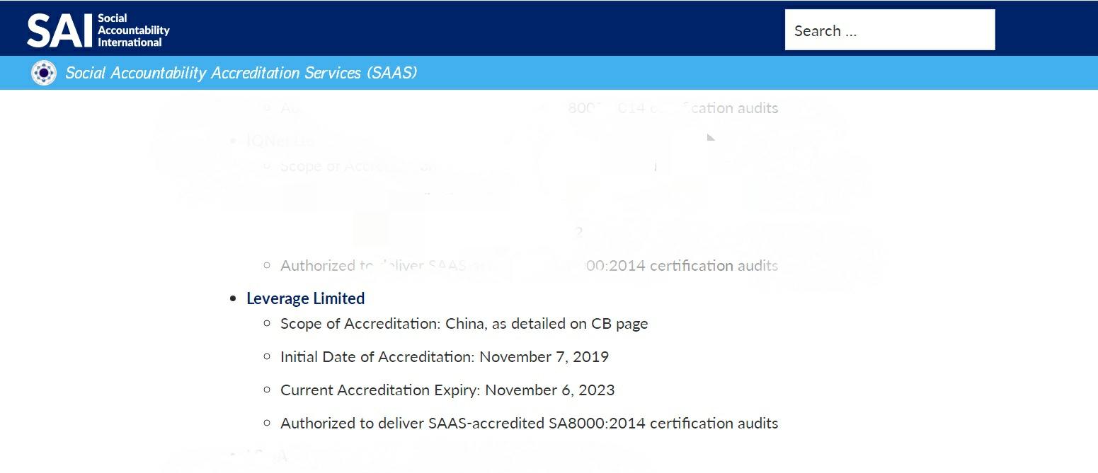 Leverage近日完成了SAAS的年度审核,将持续为客户提供SA8000认证服务。