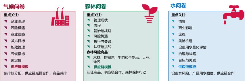 CDP问卷分为气候变化、水安全、森林三类,调查问卷为公司向其利益相关者提供环境信息提供了一个框架,内容涵盖管治及政策、风险及机会管理、环境目标、策略及情景分析。其中,气候变化问卷旨在提升企业对温室气体排放量的意识及管理,并透过测量及披露来缓解气候变化风险,是当前回复数量最多的问卷。