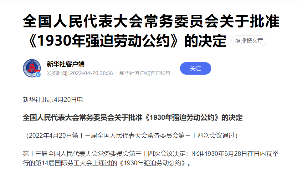 2022年4月20日全国第十三届全国人民代表大会常务委员会第三十四次会议决定:批准1930年6月28日在日内瓦举行的第14届国际劳工大会上通过的《1930年强迫劳动公约》。