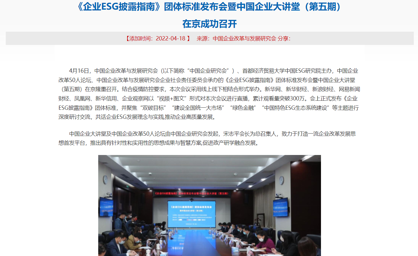 4月16日,中国企业改革与发展研究会(以下简称“中国企业研究会”)、首都经济贸易大学中国ESG研究院主办,中国企业改革50人论坛、中国企业改革与发展研究会企业社会责任委员会承办的《企业ESG披露指南》团体标准发布会暨中国企业大讲堂(第五期)在京隆重召开。