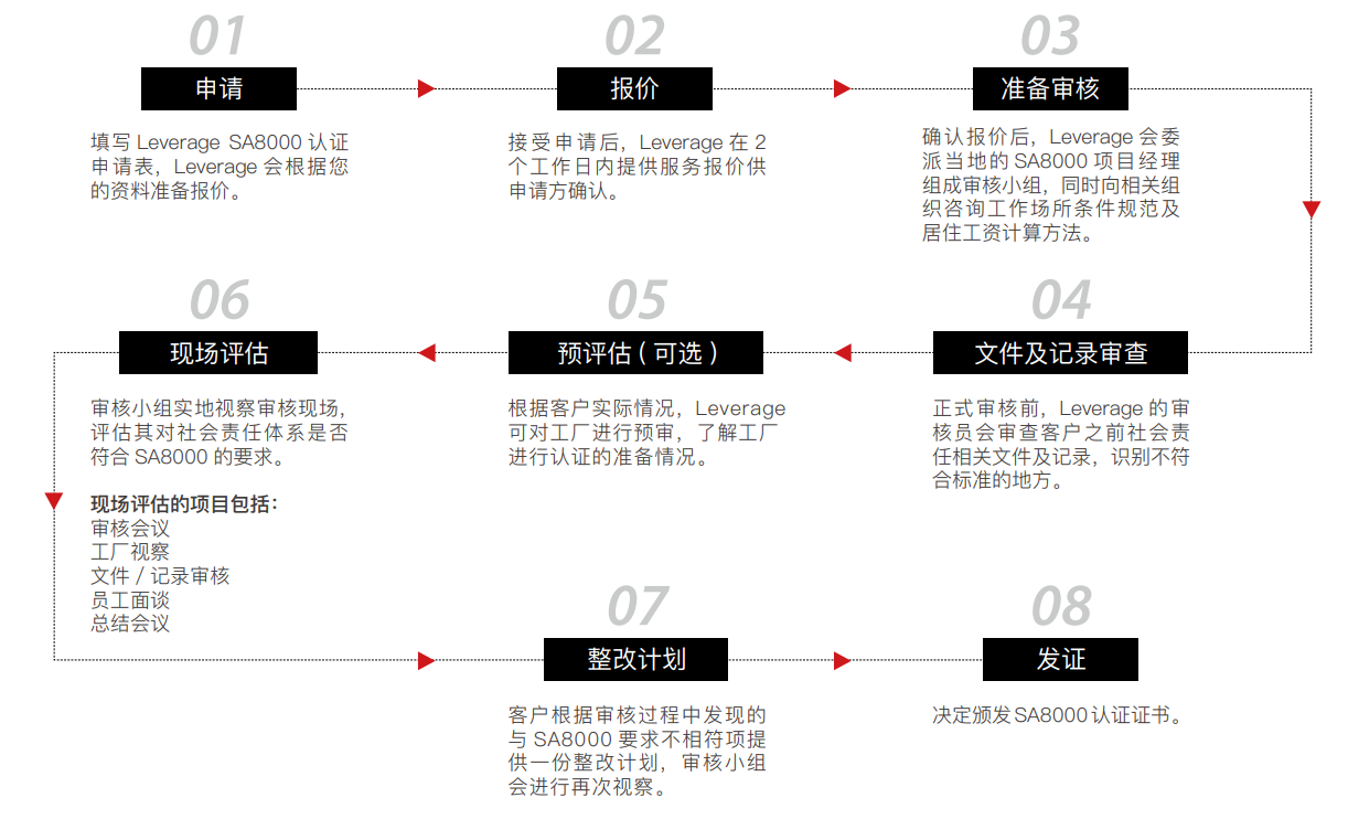 Leverage 作为一家廉洁、透明、负责任的国际供应链管理服务机构,是中国国家认证认可监督管理委员会认证机构(CNCA-R-2020-707)、中国合格评定国家认可委员会检验鉴定机构(CNAS IB0605)、国际劳工组织(ILO)SCORE 可持续发展项目许可机构,同时也是SAAS 认可的发证机构,可为客户提供SA8000审核服务。Leverage致力于通过我们优质的服务助力客户实现企业及供应链可持续发展目标的实现。