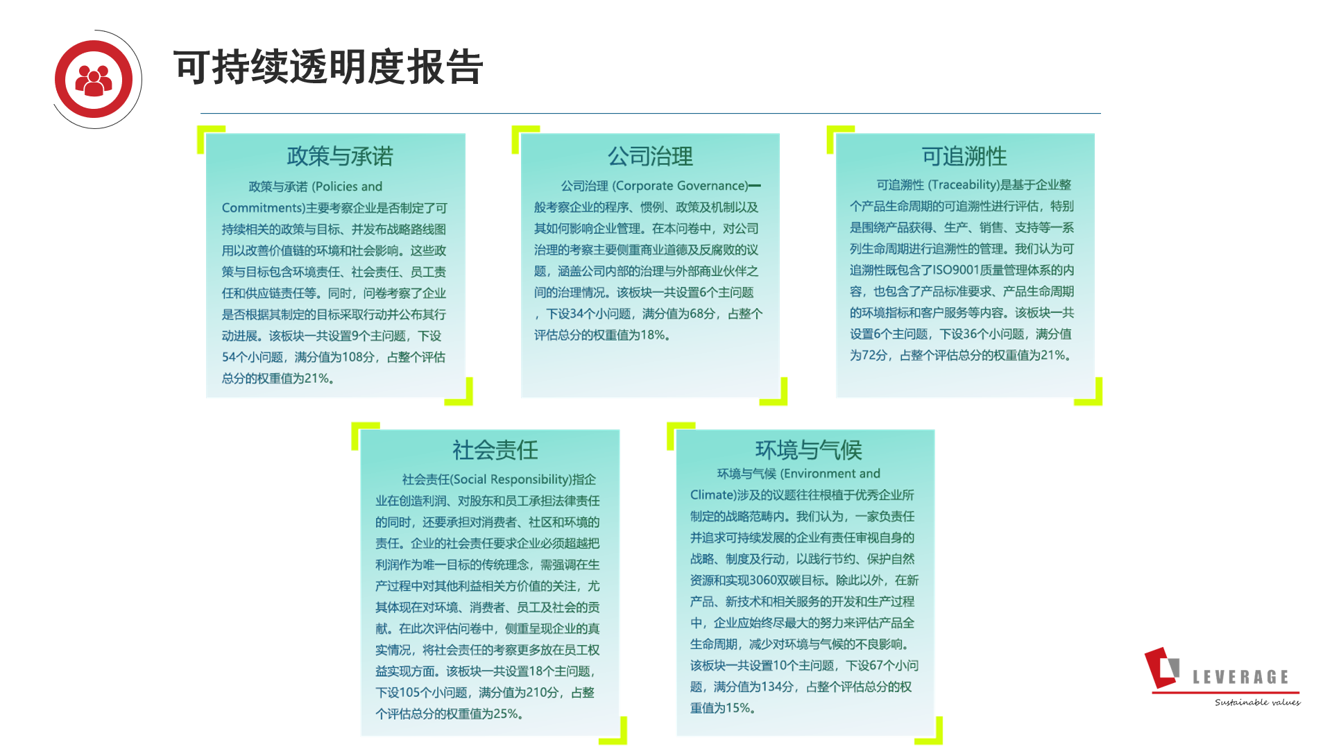 我们认为像ILO、SA8000、FLA等这些都属于“公约式”社会责任倡议或规范,我们的可持续透明度指数参考了这些指标进行编制。