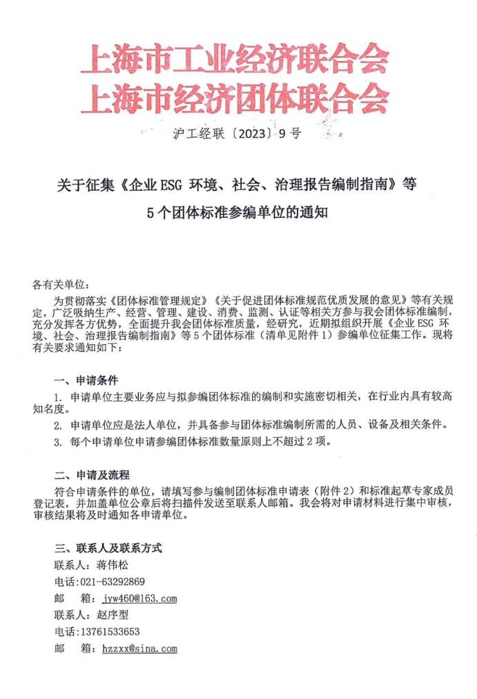 为贯彻落实《团体标准管理规定》《关于促进团体标准规范优质发展的意见》等有关规定,广泛吸纳生产、经营、管理、建设、消费、监测、认证等相关方参与我会团体标准编制,充分发挥各方优势,全面提升我会团体标准质量,经研究,近期拟组织开展《企业ESG 环境、社会、治理报告编制指南》等5个团体标准(清单见附件1)参编单位征集工作。现将有关要求通知如下: