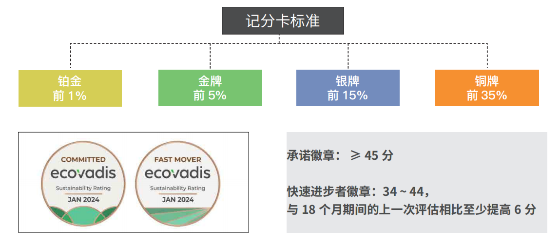 EcoVadis 是一个在线的企业社会责任 CSR 验证平台,通过评估供应商的 CSR 表现提供改善指导,旨在 利用全球供应链的影响改进公司的环境和社会实践表现。它结合了企业运作除质量以外的所有组织治理 项目,根据企业不同规模和行业归属,以在线提交资料方式进行综合评价。评价系统主要围绕公司环境, 劳工和人权,商业道德,可持续采购四个方面。
