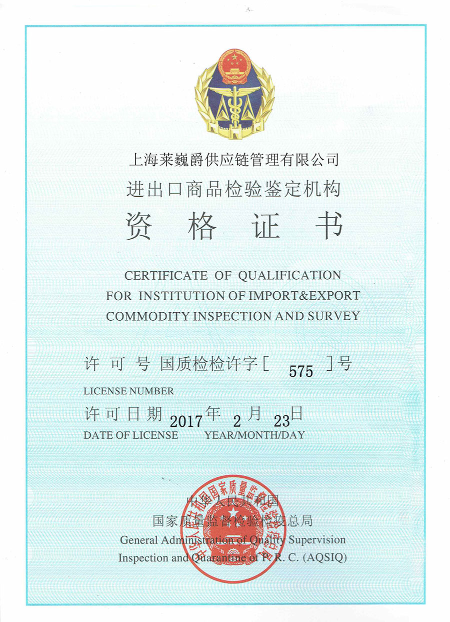 2017年2月23日,国家质检总局正式批准上海莱巍爵供应链管理有限公司成为“进出口商品检验鉴定机构”。莱巍爵目前可以接受从事进出口服装/家具产品的检验工作。