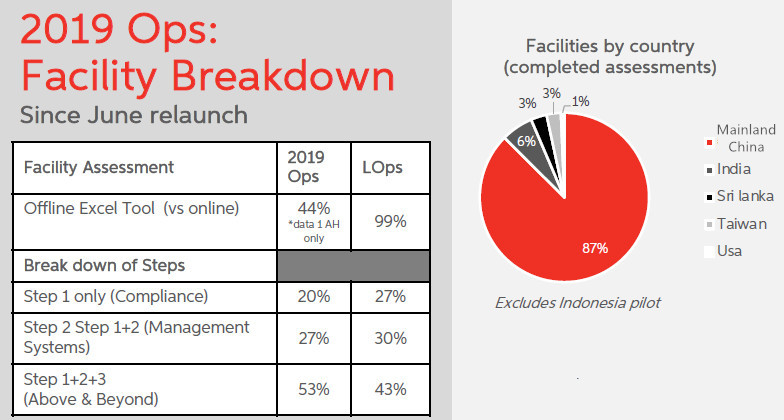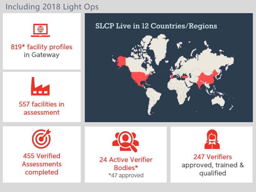 - SLCP已在12个国家或地区上线,其中Gateway上工厂数量达819家,有 557家进行了自评,其中445家完成了验证(包括了18年LOps)。