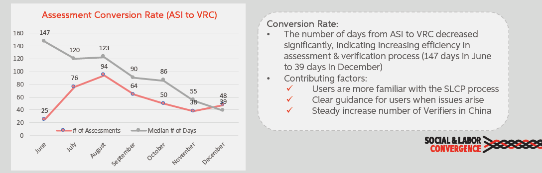 - 自评开始(Self/ Joint-Assessment Initiated, 即ASI)到验证完成(Verification Finalized, 即VRF)的周期从2019年6月的147天缩短到12月的39天。其影响因素包括:使用者对SLCP的流程 更加熟悉、使用者在遇到问题后可获得清晰的指导、中国验证员数量稳步增长。