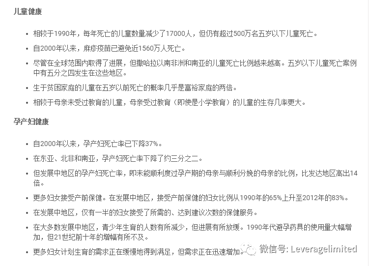 自1990年以来,孕产妇 死亡率已经降低了约50% ;2000年以来,麻疹疫苗使大约1560万人转危为安;到2014年底, 已为1360万人提供了抗逆转录病毒疗法。