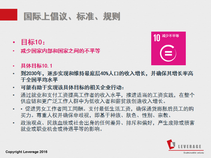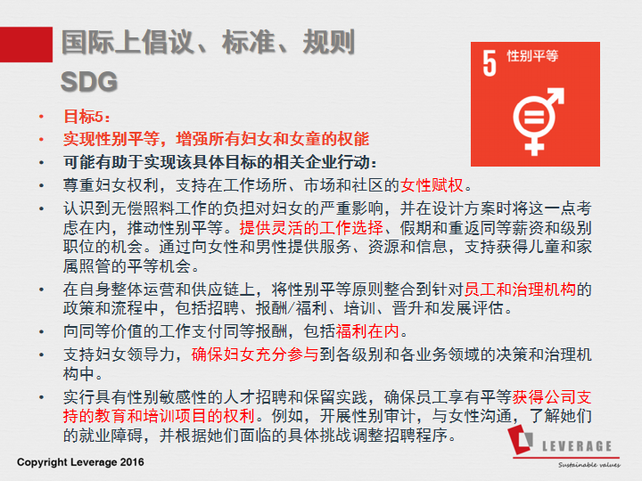 联合国可持续发展目标的目标5和目标10,不仅关注了性别平等,并呼吁公司、组织及国家都要消除不平等;为实现企业的D&I设立了时间表。