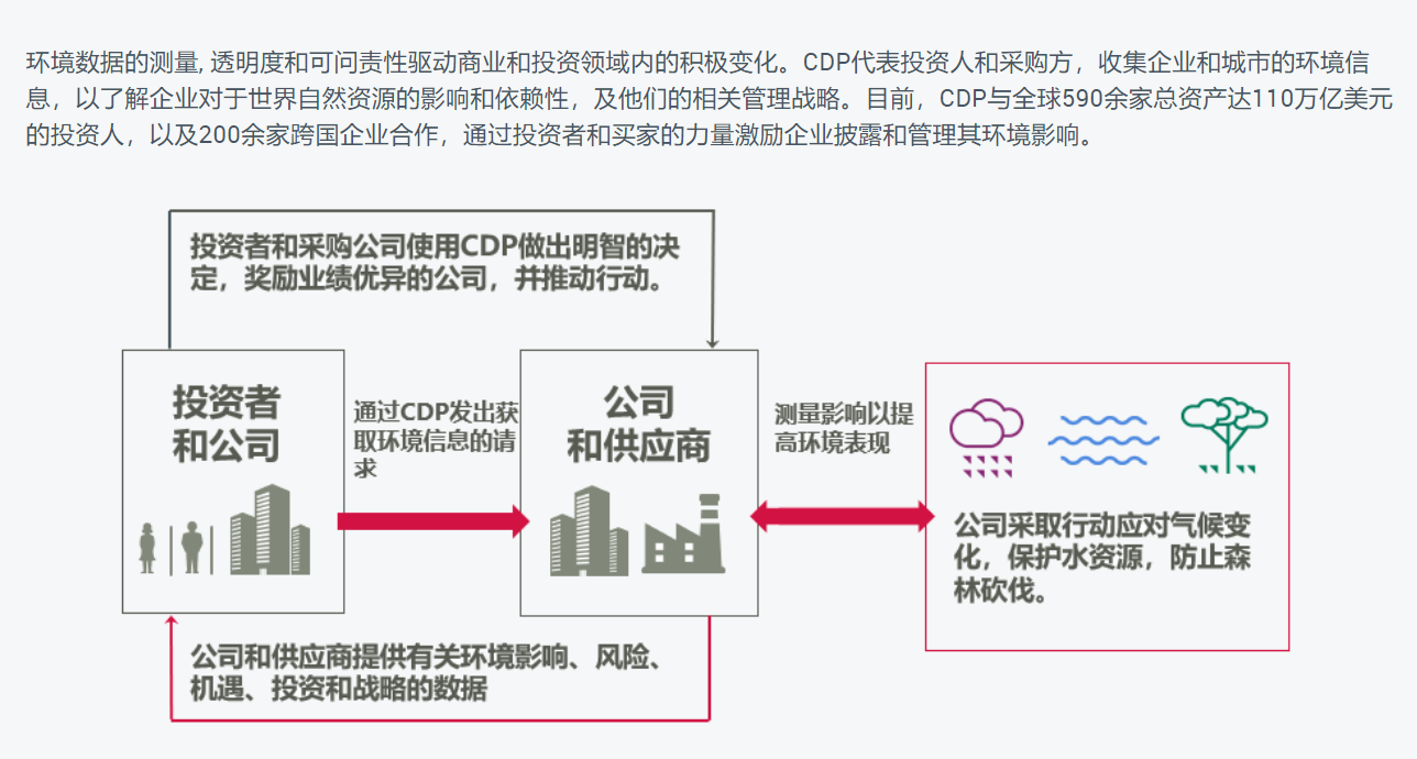 CDP代表投资人和采购方,收集企业和城市的环境信息,以了解企业对于世界自然资源的影响和依赖性,及他们的相关管理战略。投资方和采购方可通过企业所披露的数据做出更优的决定,同时CDP信息披露也可以推动企业改善自身实践。